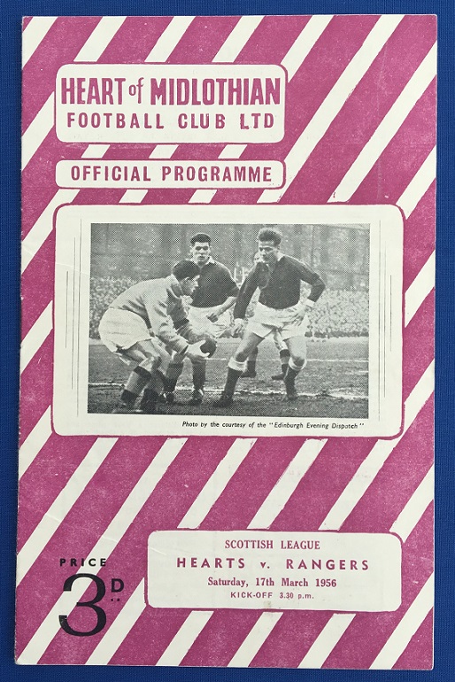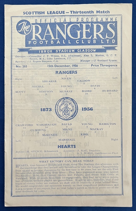 15th December 1956 – Rangers v Hearts Scottish League match played at Ibrox in front of a crowd of 45,000. Rangers won the match 5-3, with goals from Murray (2), Hubbard, Davis & Simpson.