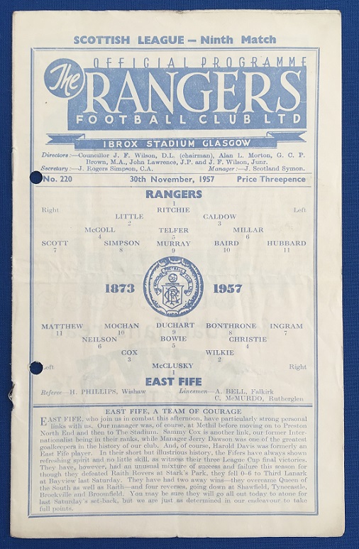 30th November 1957 – Rangers v East Fife Scottish League match played at Ibrox in front of 26,000. The match ended in a 3-3 draw, with Murray, Baird & Davis scoring for Rangers.