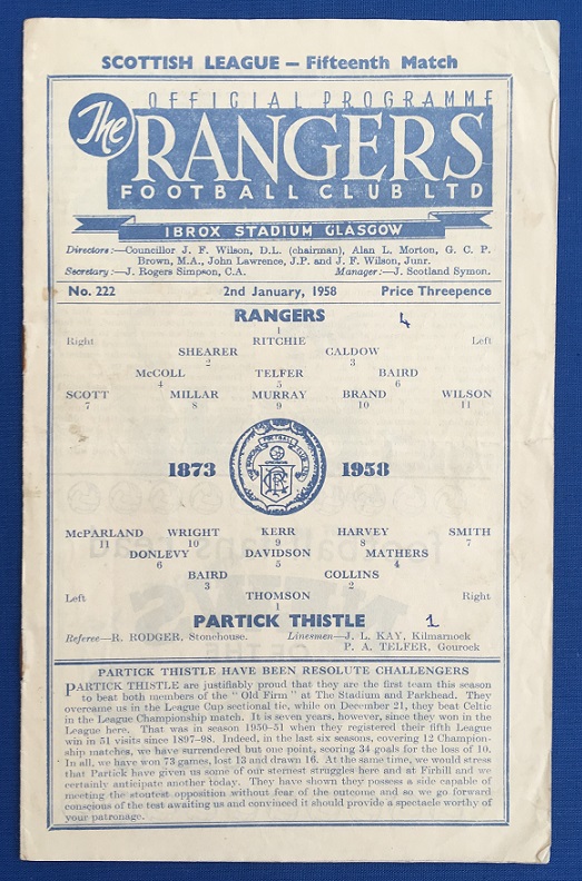 2nd January 1958 – Rangers Partick Thistle Scottish League match played at Ibrox in front of a crowd of 30,000. Rangers won the match 2-0, with goals from Murray & Scott.