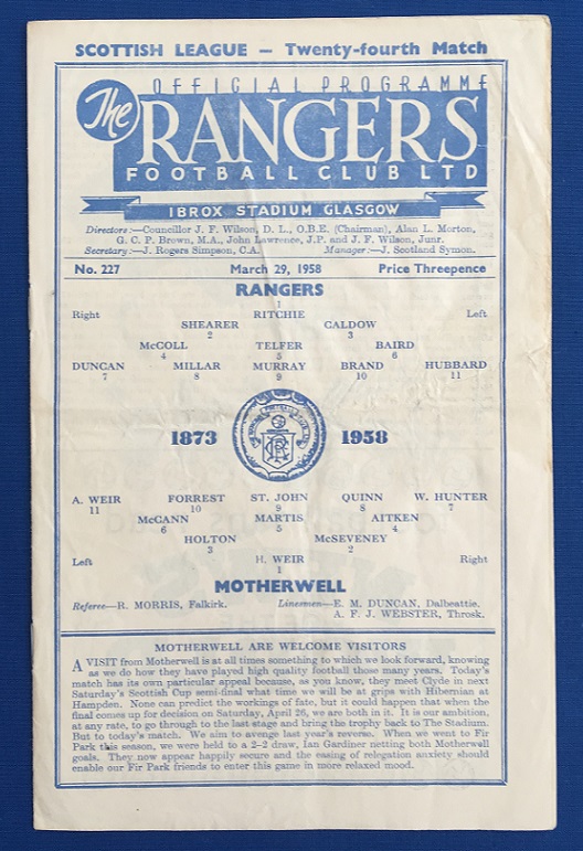 29th March 1958 – Rangers v Motherwell Scottish League match played at Ibrox in front of 40,000. The match ended in a 2-2 draw, with Millar & Duncan scoring for Rangers.