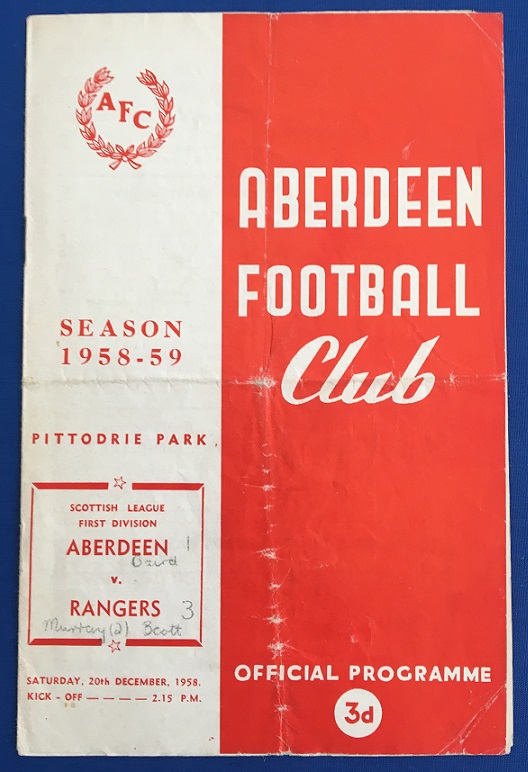 20th December 1958 – Aberdeen v Rangers Scottish League match played at Pittodrie in front of a crowd of 18,000. Rangers won the match 3-1, with goals from Murray, Brand & Scott.