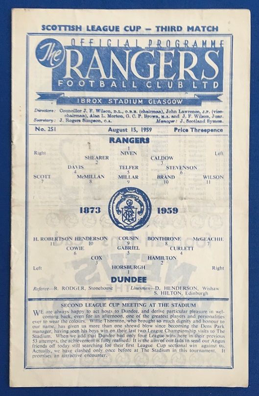 15th August 1959 – Rangers v Dundee Scottish League Cup tie played at Ibrox in front of a crowd of 37,000. Rangers won the match 2-0, with goals from Brand & Wilson.