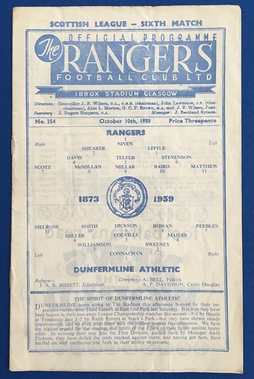 3rd October 1959 – Rangers v Dunfermline Athletic Scottish League match played at Ibrox in front of 25,000. Rangers won the match 4-1, with goals from McMillan (2), Millar & Scott.