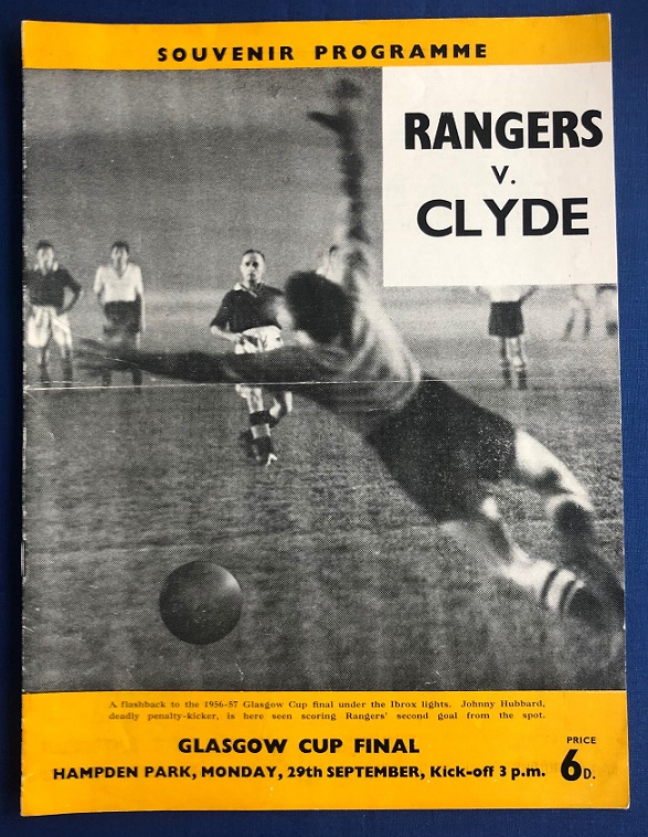 29th September 1958 – Rangers v Clyde Glasgow Cup Final tie played at Hampden in front of 35,000. The match ended in a 0-0 draw. Clyde went on to win the replay 1-0 on the 22nd October 1958.