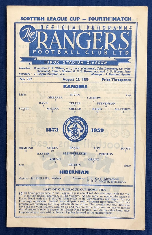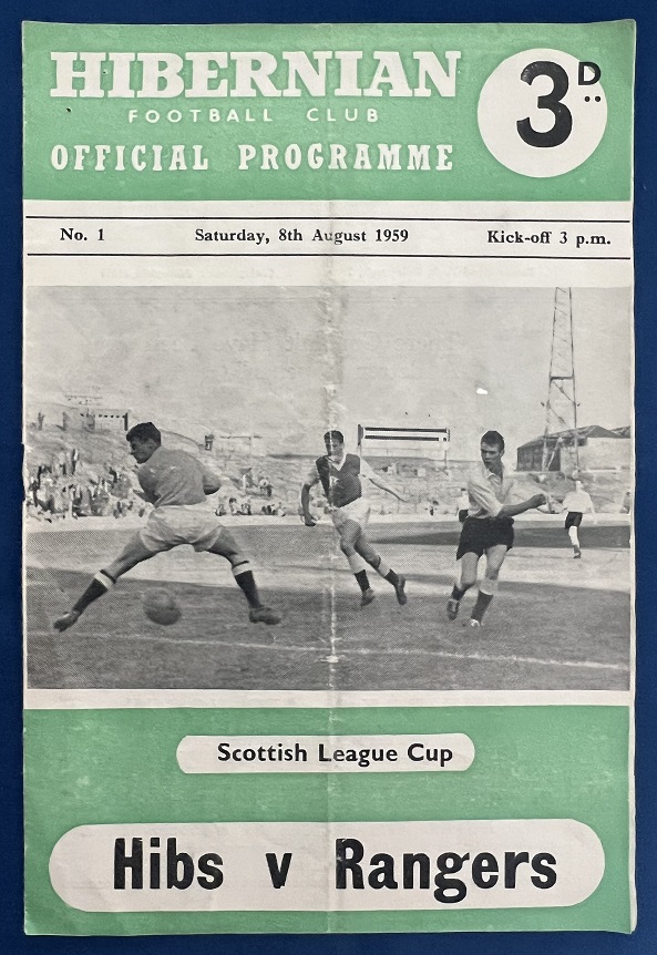 22nd August 1959 – Rangers v Hibernian Scottish League Cup tie played at Ibrox in front of a crowd of 35,000. Rangers won the match 5-0, with goals from Wilson (2), Millar (2) & Baird.