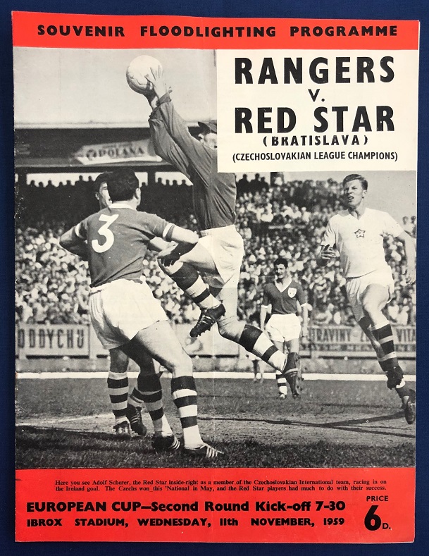 11th November 1959 – Rangers v Red Star Belgrade European Cup tie played at Ibrox in front of a crowd of 80,000. Rangers won the match 4-3, with goals from McMillan, Scott, Wilson & Millar.