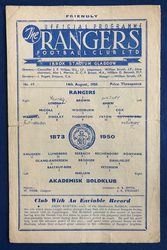 14th August 1950 – Rangers v Akademisk Boldklub friendly match played at Ibrox in front of a crowd of 50,000. Rangers won the match 2-1, with the Rangers goals scored by Findlay & Rutherford.