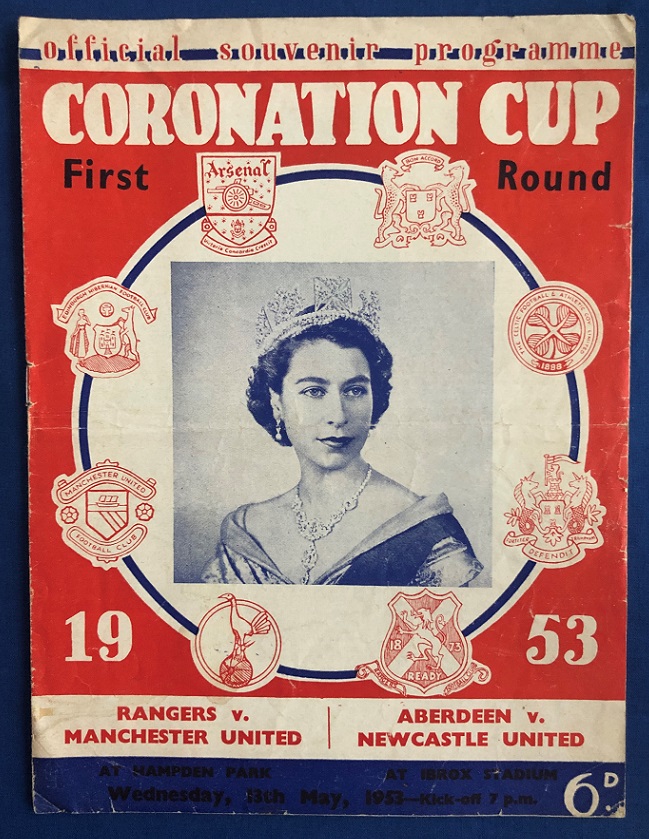 13th May 1953 – Rangers v Manchester United Coronation Cup tie played at Hampden in front of a crowd of 75,546. Rangers lost the match 2-1, with McMillan scoring for rangers.