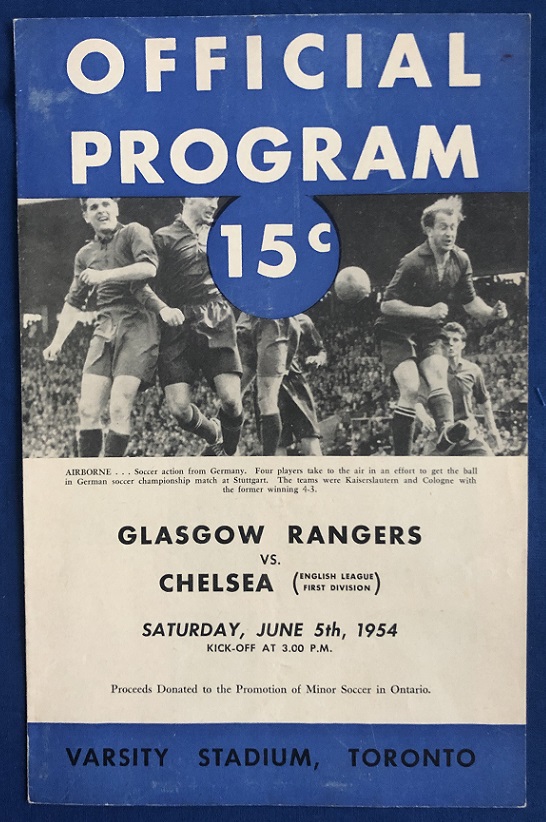 5th June 1954 – Rangers v Chelsea friendly match played at the Varsity Stadium, Toronto, Canada in front of 17,000. Rangers lost the match 4-1, with Simpson scoring for Rangers.