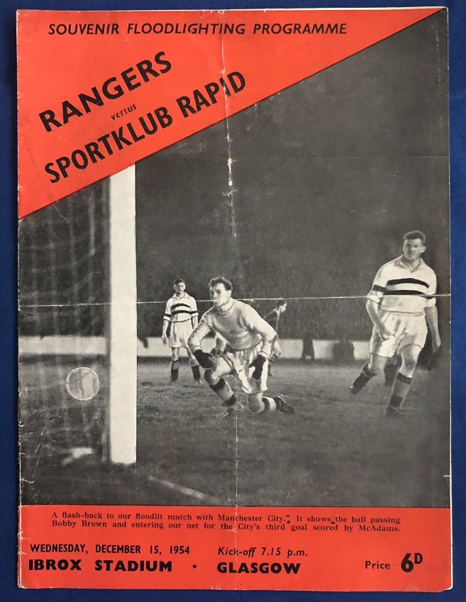 15th December 1954 – Rangers v Rapid Vienna friendly match played at Ibrox in front of 50,000. Rangers won the match 1-0, with a goal from Prentice.