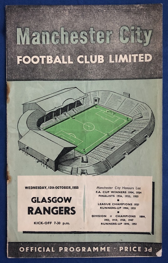 12th October 1955 – Manchester City v Rangers friendly match played at Maine Road in front of 17,000. Rangers won the match with goals from Baird & Queen.