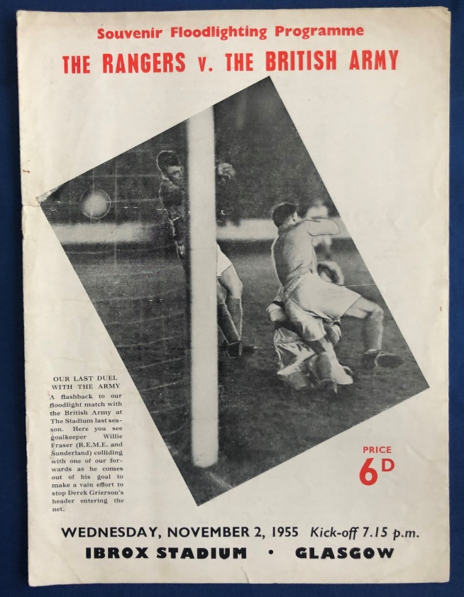 2nd November 1955 – Rangers v The British Army friendly match played at Ibrox in front of a crowd of 18,000. Rangers won the match 2-0, with goals from Baird & Simpson.
