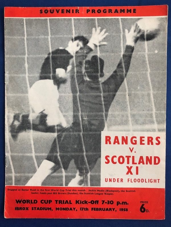 17th February 1958 – Rangers v Scotland XI friendly match played at Ibrox in front of a crowd of 55,217. The match ended in a 1-1 draw, with Murray scoring for Rangers.