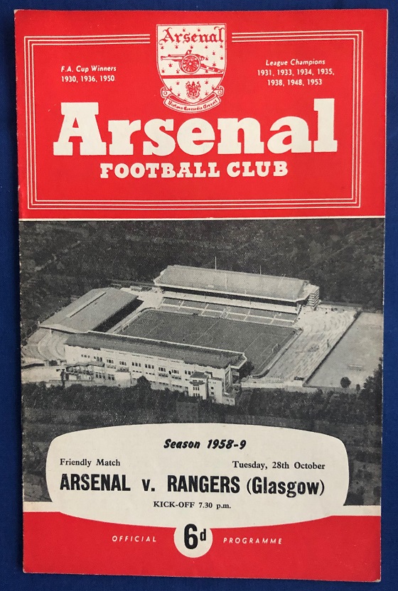 28th October 1958 – Programme for the postponed Arsenal v Rangers friendly match due to be played at Highbury.