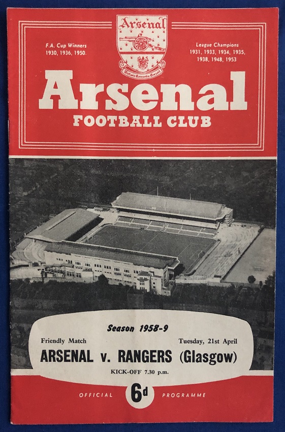 21st April 1959 – Arsenal v Rangers friendly played at Highbury in front of 34,500. Rangers won the match 3-0, with goals from Brand (2) & Caldow.