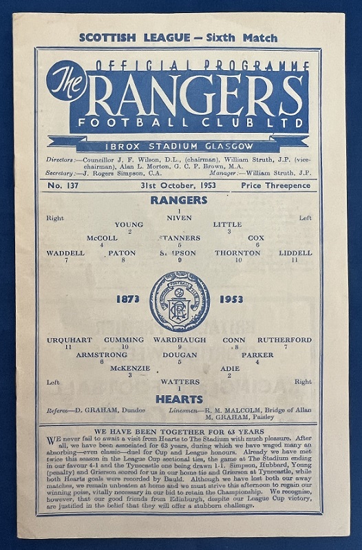 31st October 1953 – Rangers v Hearts Scottish League match played at Ibrox in front of 41,000. Rangers lost the match 1-0.