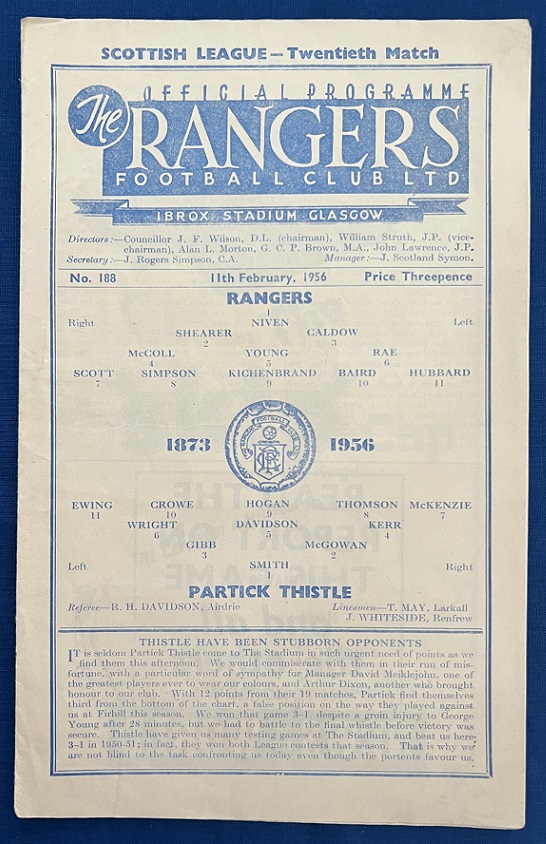11th February 1956 – Rangers v Partick Thistle Scottish League match played at Ibrox in front of a crowd of 45,000. Rangers won the match 1-0, with a goal from Kitchenbrand.