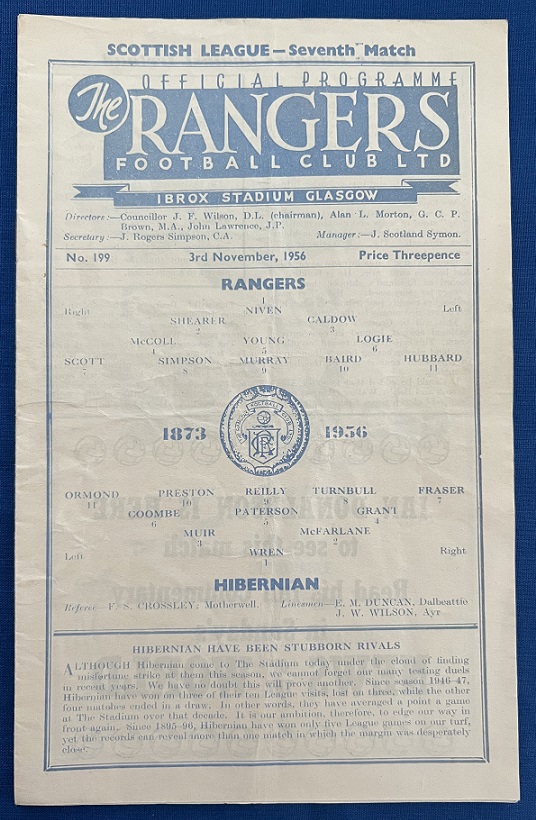 3rd November 1956 – Rangers v Hibernian Scottish League match played at Ibrox in front of 45,000. Rangers won the match 5-3, with goals from Murray (2), Scott, Hubbard & Simpson.