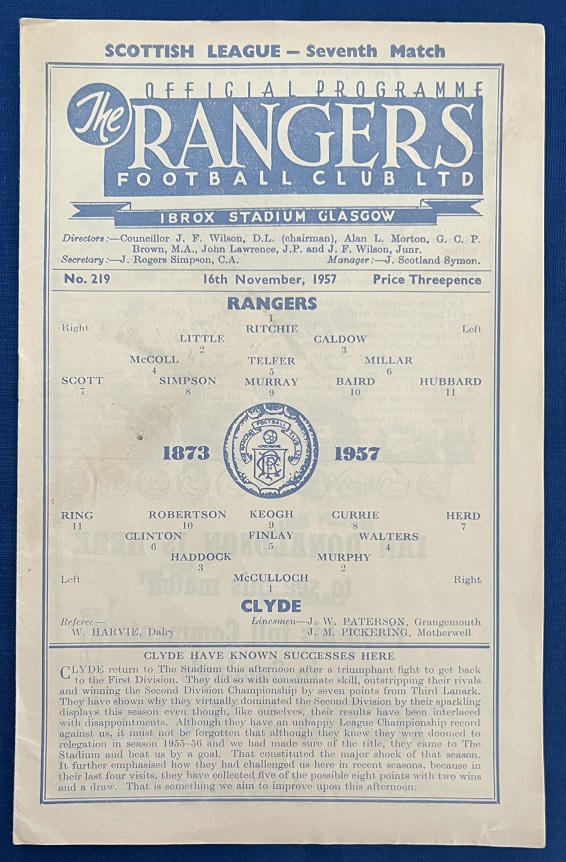 16th November 1957 – Rangers v Clyde Scottish League match played at Ibrox in front of a crowd of 65,000. Rangers won the match 2-0, with Baird (2) scoring.