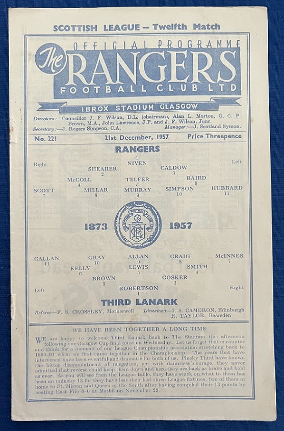 21st December 1957 – Rangers v Third Lanark Scottish League match played at Ibrox in front of 22,000. Rangers won the match 5-1, with goals from Murray (2), Shearer, Wilson & Brand.