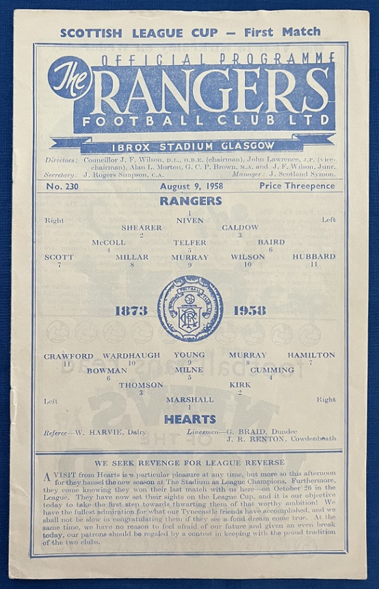 9th August 1958 – Rangers v Hearts Scottish League Cup tie played at Ibrox in front of 65,000. Rangers won the match 3-0, with goals from Wilson, Hubbard & Millar.