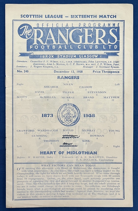 13th December 1958 – Rangers v Hearts Scottish League match played at Ibrox in front of a crowd of 66,000. Rangers won the match 5-0, with goals from Murray (3) & Brand (2).