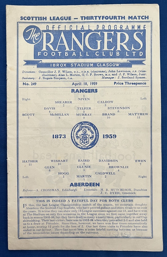 18th April 1959 – Rangers v Aberdeen Scottish League match played at Ibrox in front of a crowd of 41,000. Rangers lost the match 2-1, with Brand scoring for Rangers.