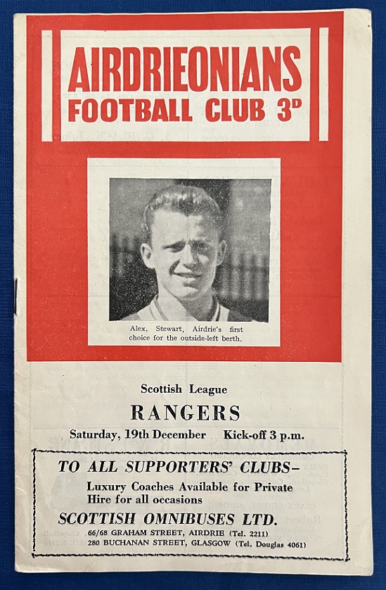 19th December 1959 – Airdrieonians v Rangers Scottish League match played at Broomfield Park in front of a crowd of 20,000. Rangers won the match 5-0, with goals from Scott (2), Stevenson, Hume & Millar.