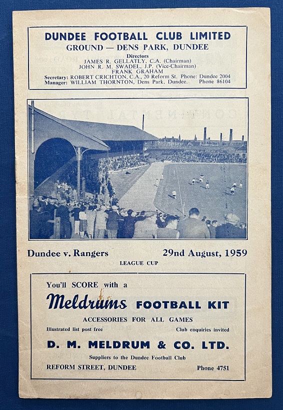 29th August 1959 – Dundee v Rangers Scottish League Cup tie played at Dens Park in front of 20,000. Rangers won the match 3-2, with goals from Millar, Wilson & Baird.