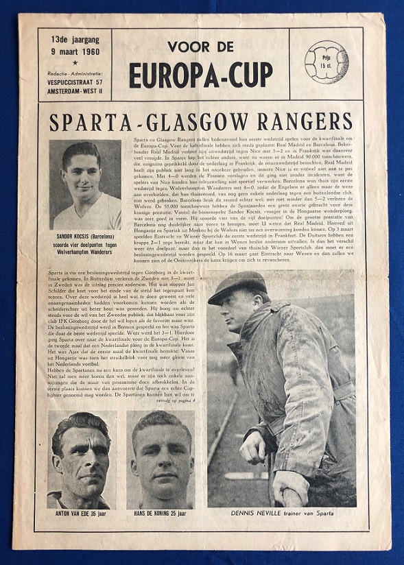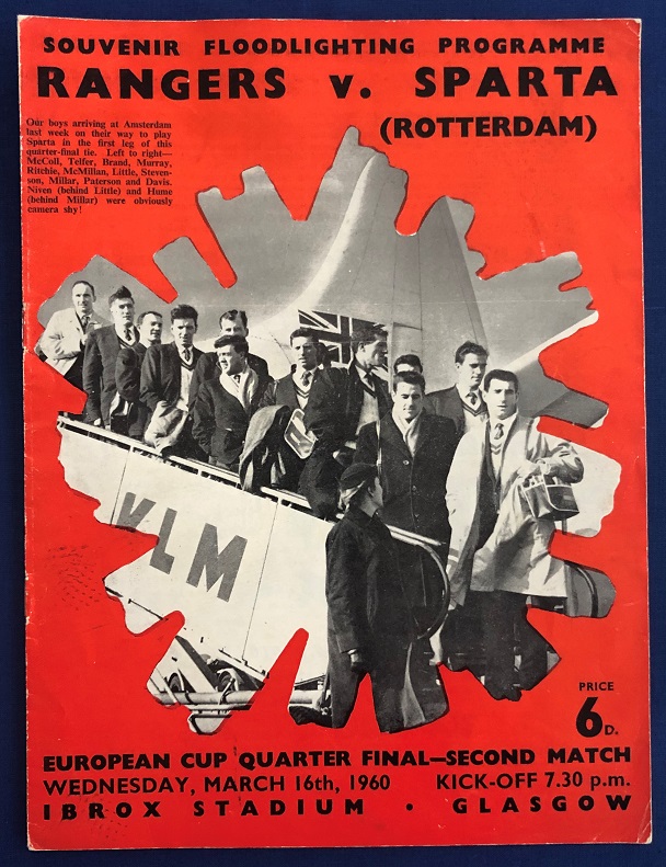 16th March 1960 – Rangers v Sparta Rotterdam European Cup tie played at Ibrox in front of a crowd of 82,587. Rangers lost the match 1-0.