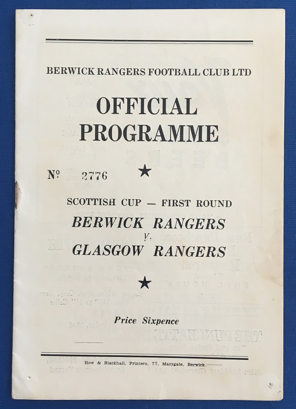 30th January 1960 – Berwick Rangers v Rangers Scottish Cup match played at Shielfield Park in front of a crowd of 16,000. Rangers won the match 3-1 with goals from Wilson (3).