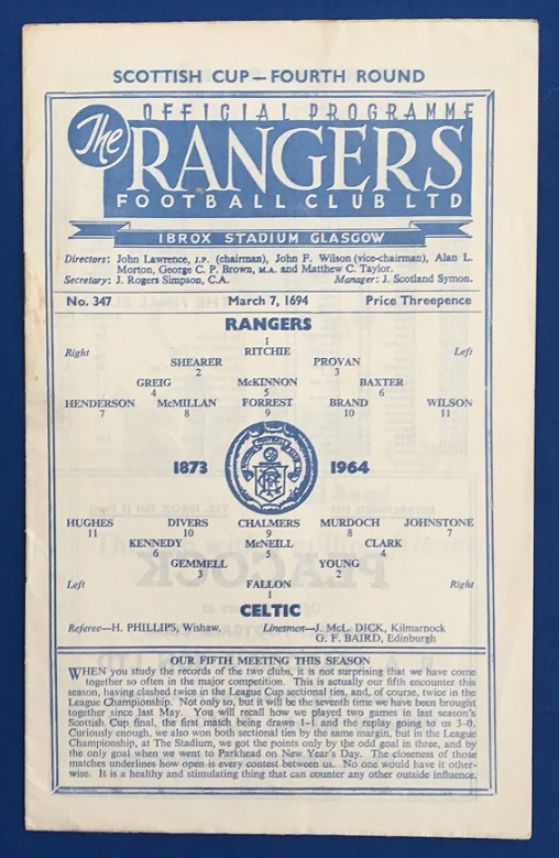 7th March 1964 – Rangers v Celtic Scottish Cup tie played at Ibrox in front of a crowd of 84,724. Rangers won the match 2-0, with goals from Forrest & Henderson. Note the date error on the programme.
