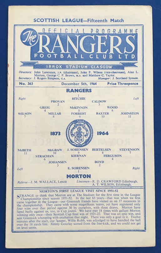 26th October 1963 – Rangers v Morton Scottish League Cup Final played at Hampden in front of a crowd of 105,907. Rangers won the match 5-0, with goals from Forrest (4) & Willoughby.