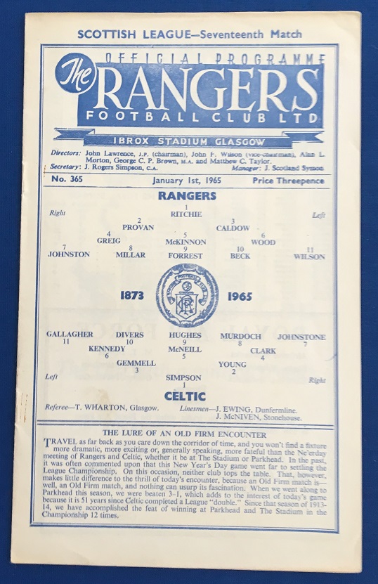 1st January 1963 – Rangers v Celtic Scottish League match played at Ibrox in front of a crowd of 55,000. Rangers won the match 4-0, with goals from Davis, Millar, Greig & Wilson.