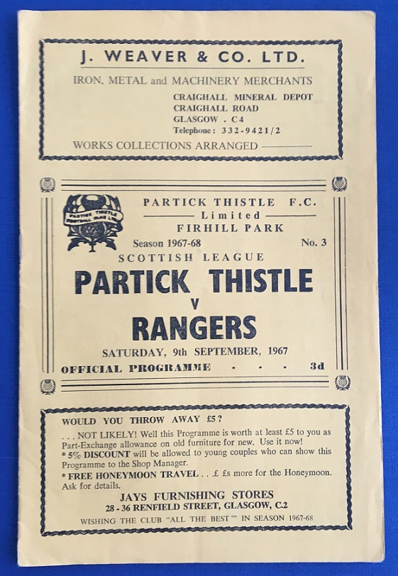 9th September 1967 – Partick Thistle v Rangers Scottish League match played at Firhill in front of a crowd of 31,000. Rangers won the match 2-0 with Penman scoring both goals for Rangers.