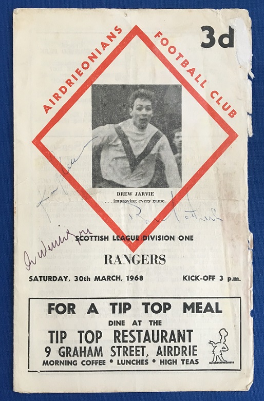 30th March 1968 – Airdrieonians v Rangers Scottish League match played at Broomfield in front of 18,000. Rangers won the match 2-1 with goals from Johnston & A. Smith.