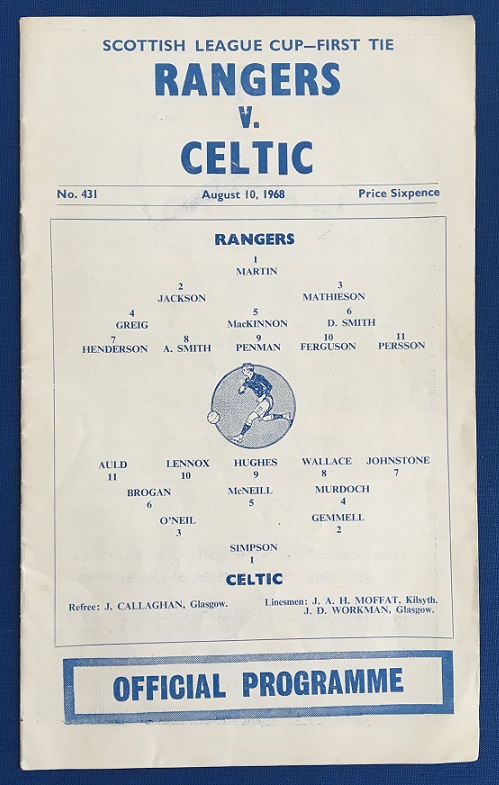 10th August 1968 – Rangers v Celtic Scottish League Cup match played at Ibrox in front of 35,000. Rangers lost the match 2-0.