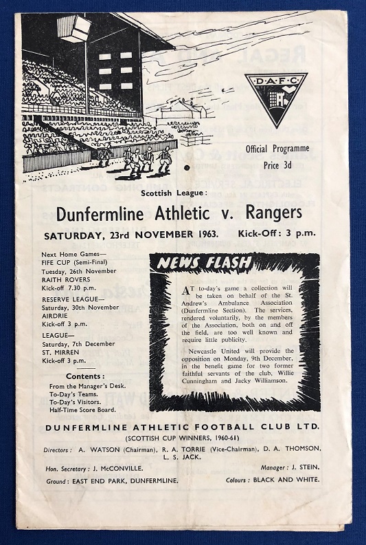 23rd November 1963 – Dunfermline Athletic v Rangers Scottish League match played at East End Park in front of a crowd of 21,000. Rangers won the match 4-1, with goals from Wilson (2), Henderson & Forrest.