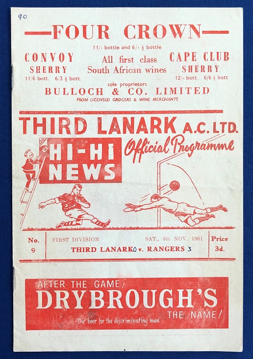 4th November 1961 – Third Lanark v Rangers Scottish League match played at Cathkin Park in front of a crowd of 30,000. Rangers won the match 3-0, with goals from Christie (2) & Brand.