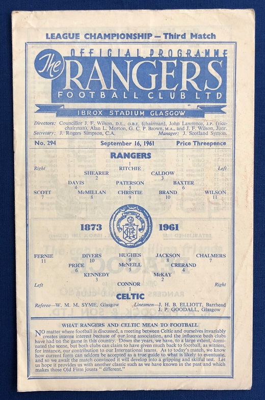 16th September 1961 – Rangers v Celtic Scottish League match played at Ibrox in front of a crowd of 70,000. The match ended in a 2-2 draw, with Christie & Baxter scoring for Rangers.