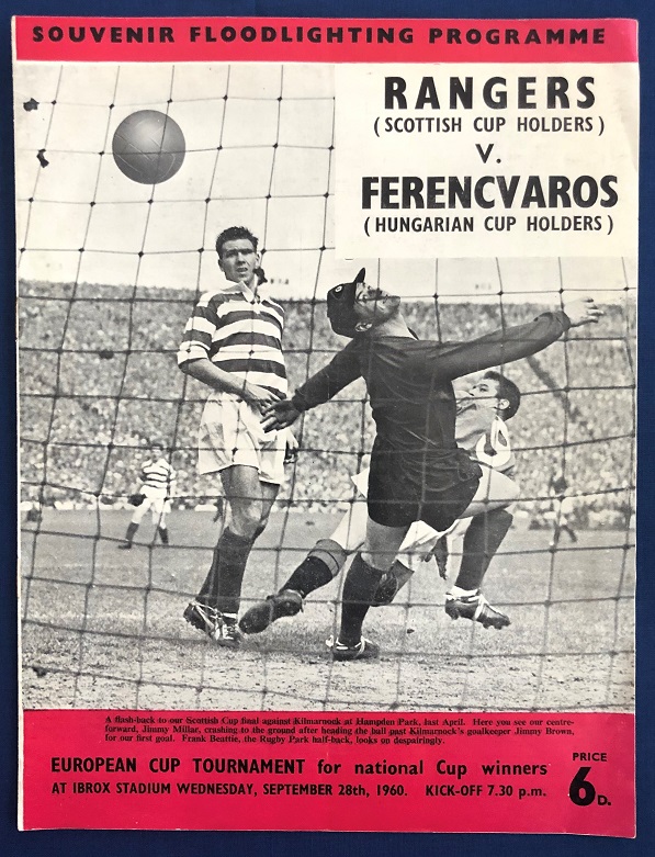 28th September 1960 – Rangers v Ferencvaros European Cup Winners Cup tie played at Ibrox in front of a crowd of 36,000. Rangers won the match 4-2, with goals from Millar (2), Davis & Brand.
