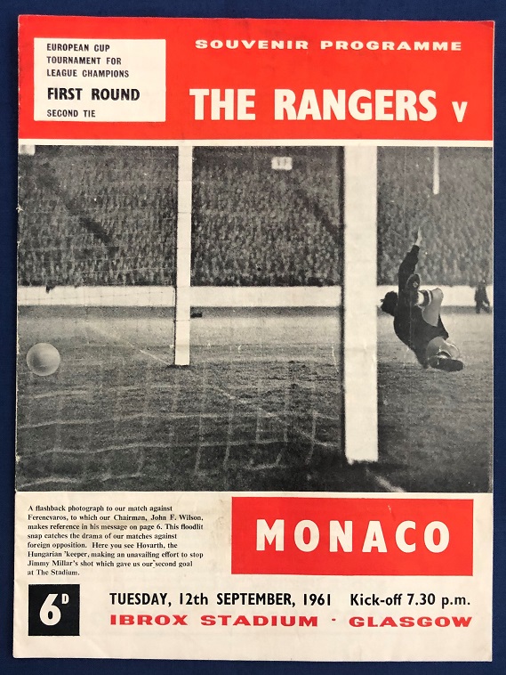 12th September 1961 – Rangers v A.S. Monaco European Cup tie played at Ibrox in front of a crowd of 67,501. Rangers won the match 3-2, with goals from Christie (2) & Scott.