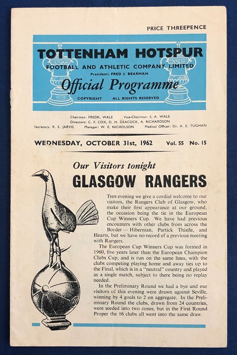 31st October 1962 – Tottenham Hotspur v Rangers European Cup Winners Cup tie played at White Hart Lane in front of a crowd of 58,859. Rangers lost the match 5-2, with Henderson & Millar scoring for Rangers.