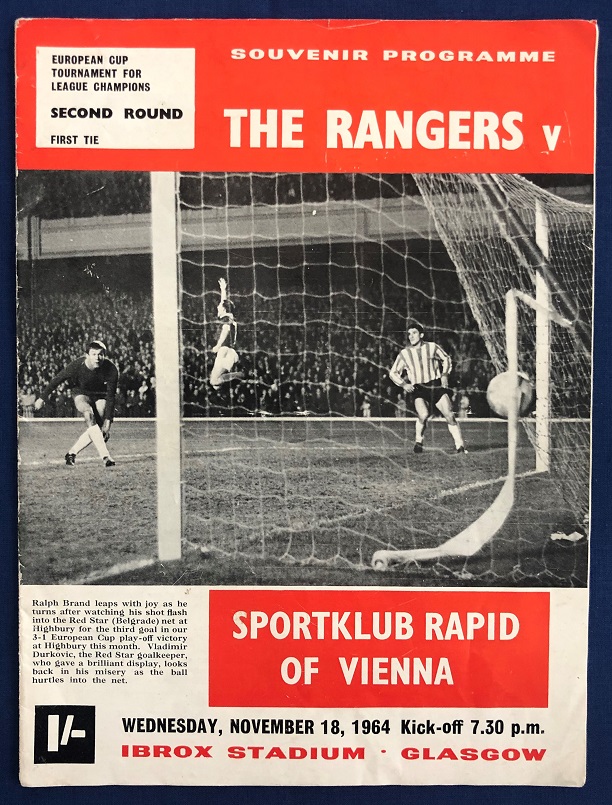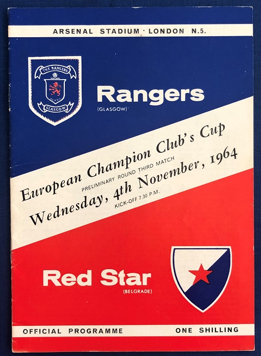 2nd September 1964 – Rangers v Red Star Belgrade European Cup tie played at Ibrox in front of a crowd of 77,669. Rangers won the match 3-1, with goals from Brand (2) & Forrest.