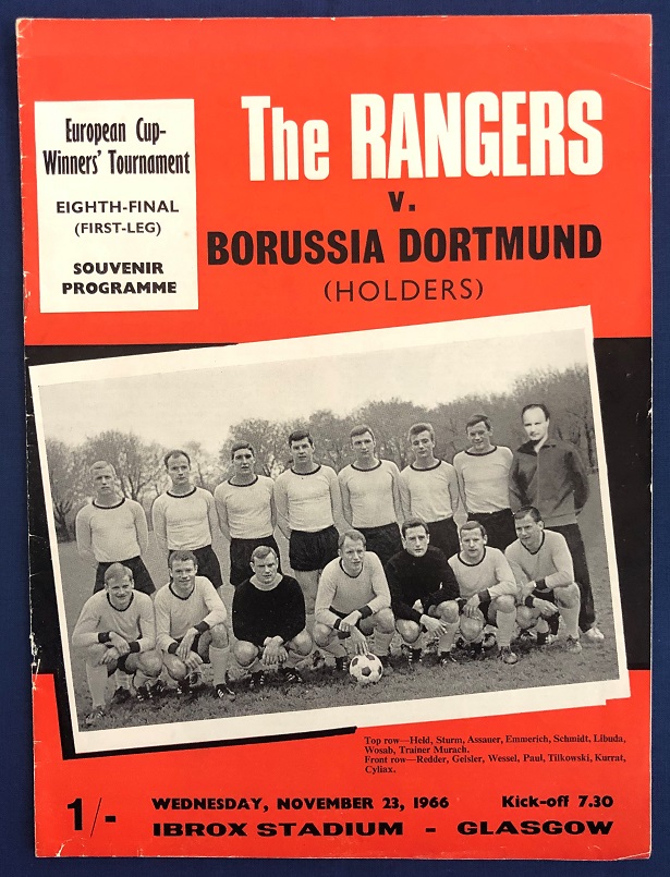23rd November 1966 – Rangers v Borussia Dortmund European Cup Winners Cup match played at Ibrox in front of a crowd of 65,000. Rangers won the match 2-1, with goals from Johansen & A. Smith.