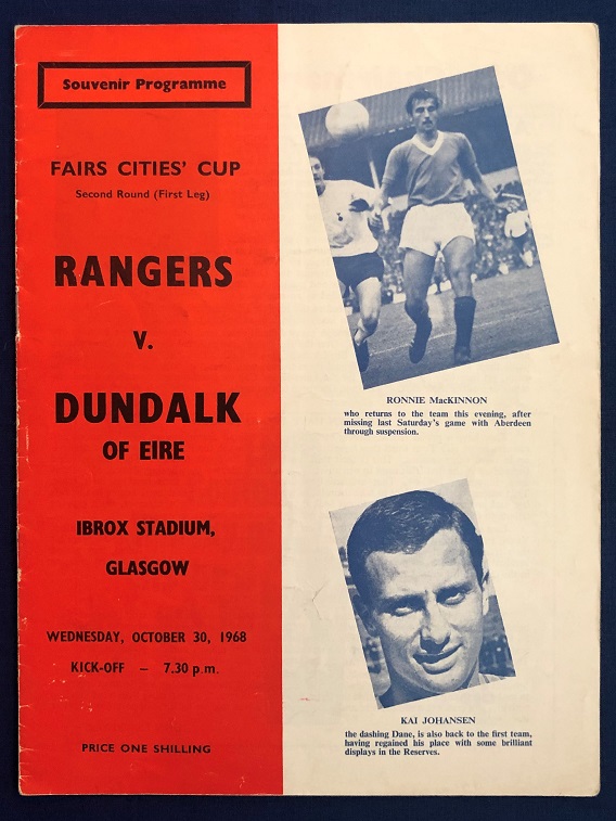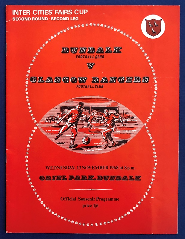 30th October 1968 – Rangers v Dundalk Inter-Cities Fairs Cup match played at Ibrox in front of 30,000. Rangers won the match 6-1 with goals from Henderson (2), Ferguson (2), Greig and a Brennan own goal.