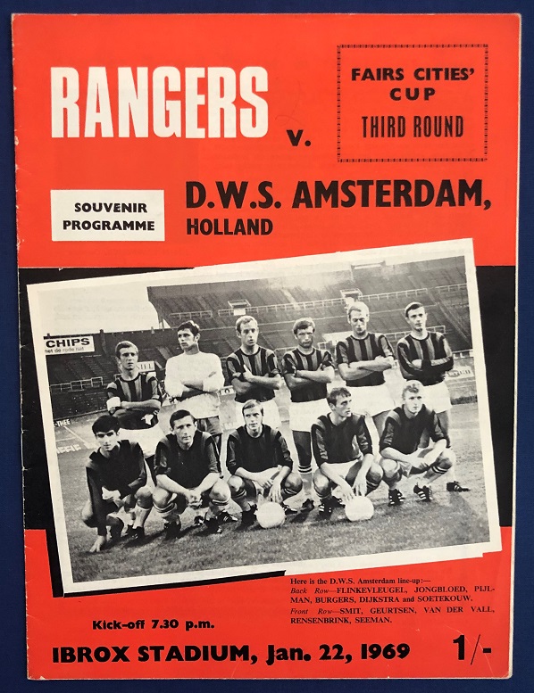 22nd January 1969 – Rangers v DWS Amsterdam Inter-Cities Fairs Cup match played at Ibrox in front of 62,000. Rangers won the match 2-1 with goals from D. Smith & Stein.