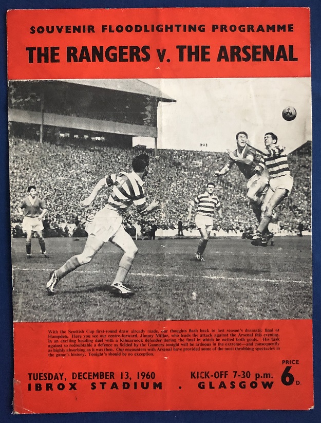 13th December 1960 – Rangers v Arsenal friendly match played at Ibrox in front of a crowd of 42,173. Rangers won the match 4-2, with goals from Brand (2), Millar & Wilson.