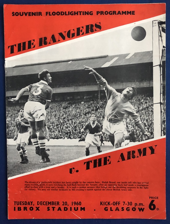 12th December 1960 – Rangers v The British Army friendly match played at Ibrox in front of 7,000. Rangers won the match 2-0, with goals from McLean & Brand.