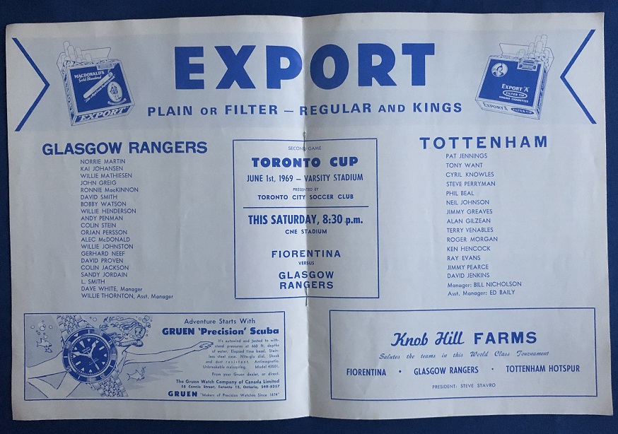 1st June 1969 – Rangers v Tottenham Hotspur Toronto Cup match played at the Varsity Stadium in front of 10,506. Rangers lost the match 4-3 with Rangers goals being scored by Stein (2) & Persson.